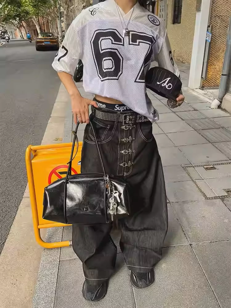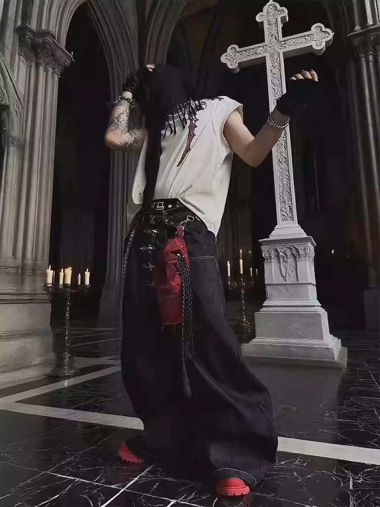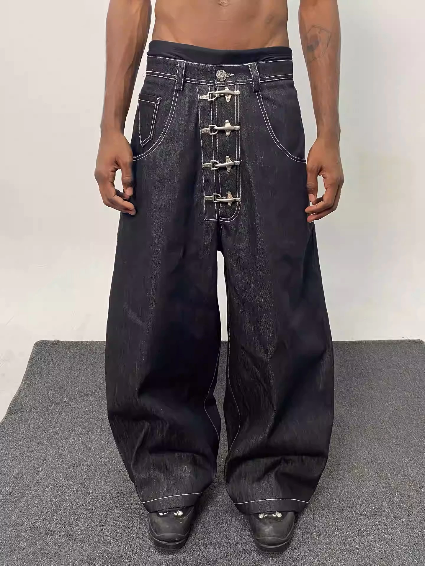 Street-style raw denim baggy cutaway jeans